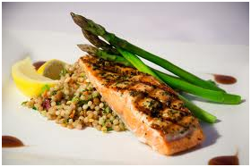 Dinner: Salmon topped with tarragon and mustard over ½ cup couscous, ½ cup zucchini, and 4 spears asparagus. Side salad of spinach, cheese and olive oil dressing.